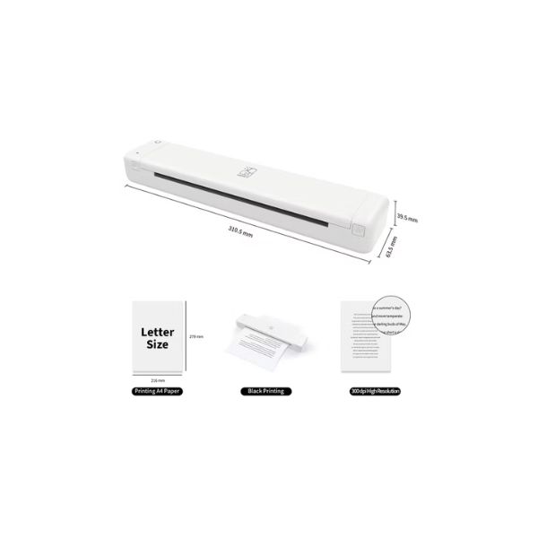 Φορητός εκτυπωτής μεγέθους Α4,θερμικής μεταφοράς, ανθεκτικής κατασκευής, ανάλυσης 300 dpi, πρωτόκολλο εκτύπωσης Bitmap, μπαταρία Λιθίου 2000 mAh, Bluetooth, Αυτόματη απενεργοποίηση, Υποδοχή USB-C, Flash 4MB, RAM 8MB, λειτουργεί με ταινία που εκτυπώνει σε κανονικό χαρτί Α4. Αξεσουαρ: Ταινία και Χαρτί Α4. Λευκό Χρώμα, απαιτείται η χρήση μελανοταινίας με κόστος ταινίας 10 € τα δύο τεμάχια